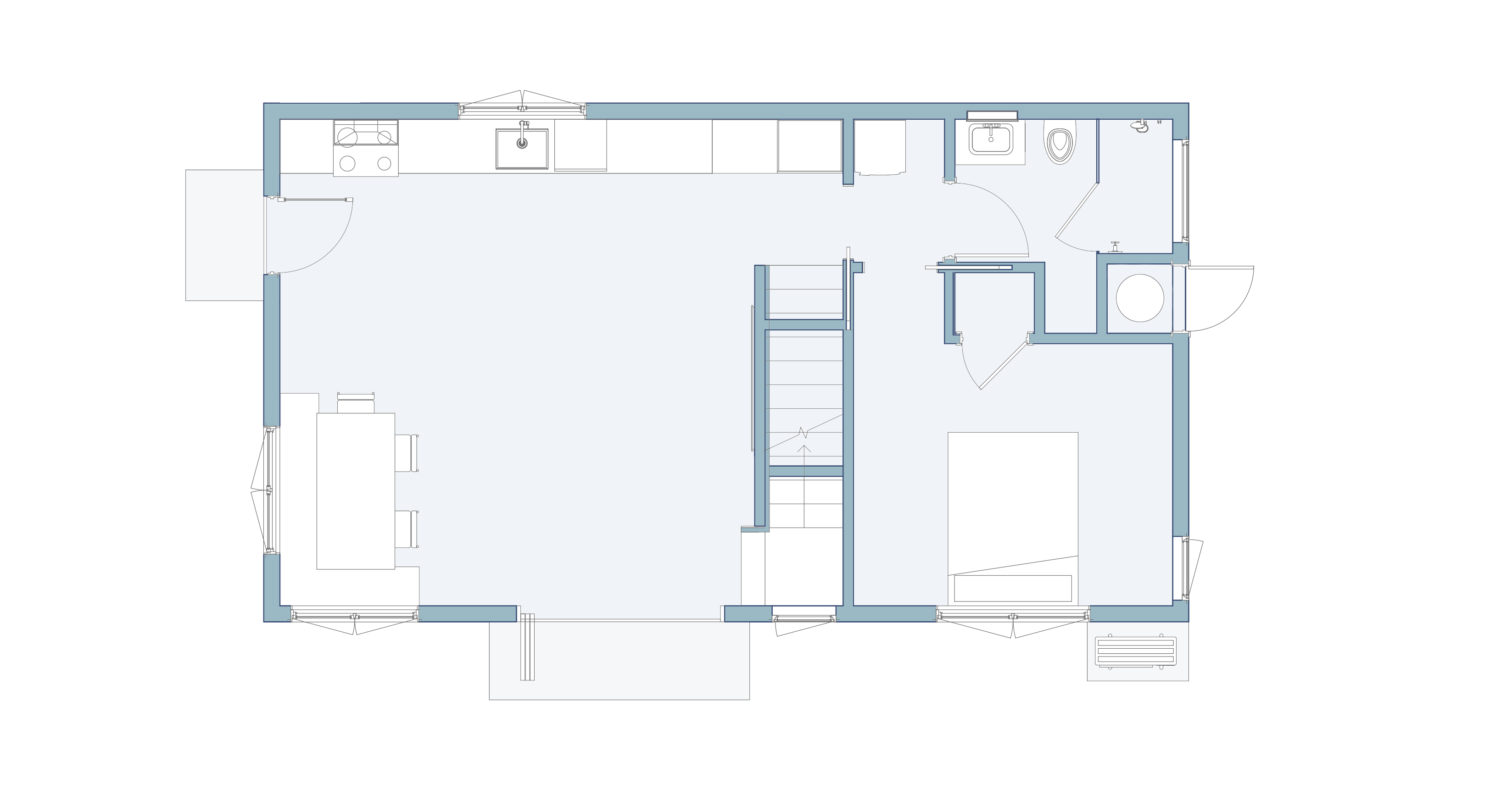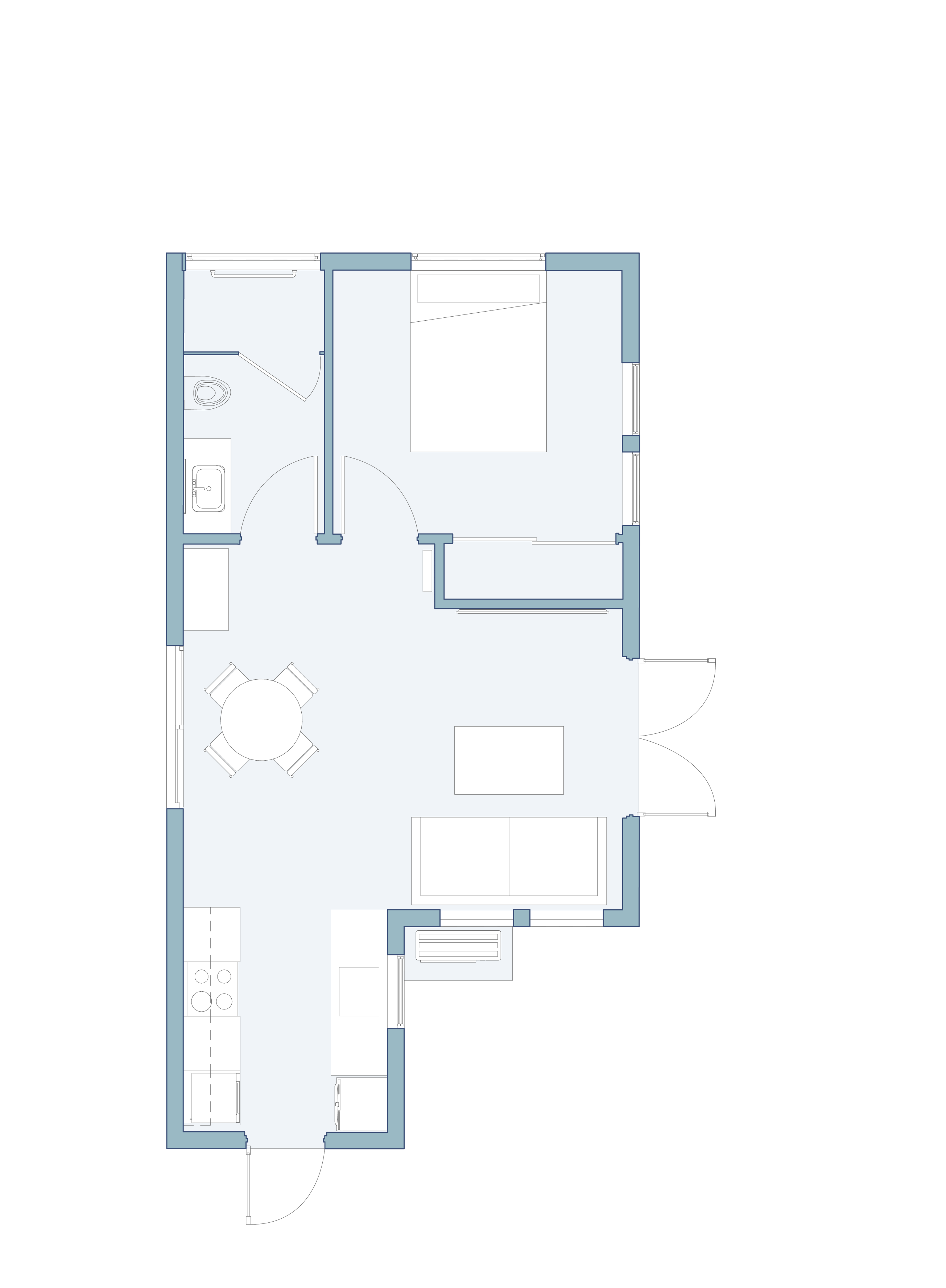 Something that people love about Oxford is it has a spacious bathroom accessible to all located remotely from the living space, windows on every exterior wall that are positioned to maximize views into the yard or garden, and built-ins that make storage easy. Oxford is best placed in the corner of a residential lot to allow for preservation of landscape features but its rectangular layout allows for a range of possibilities.